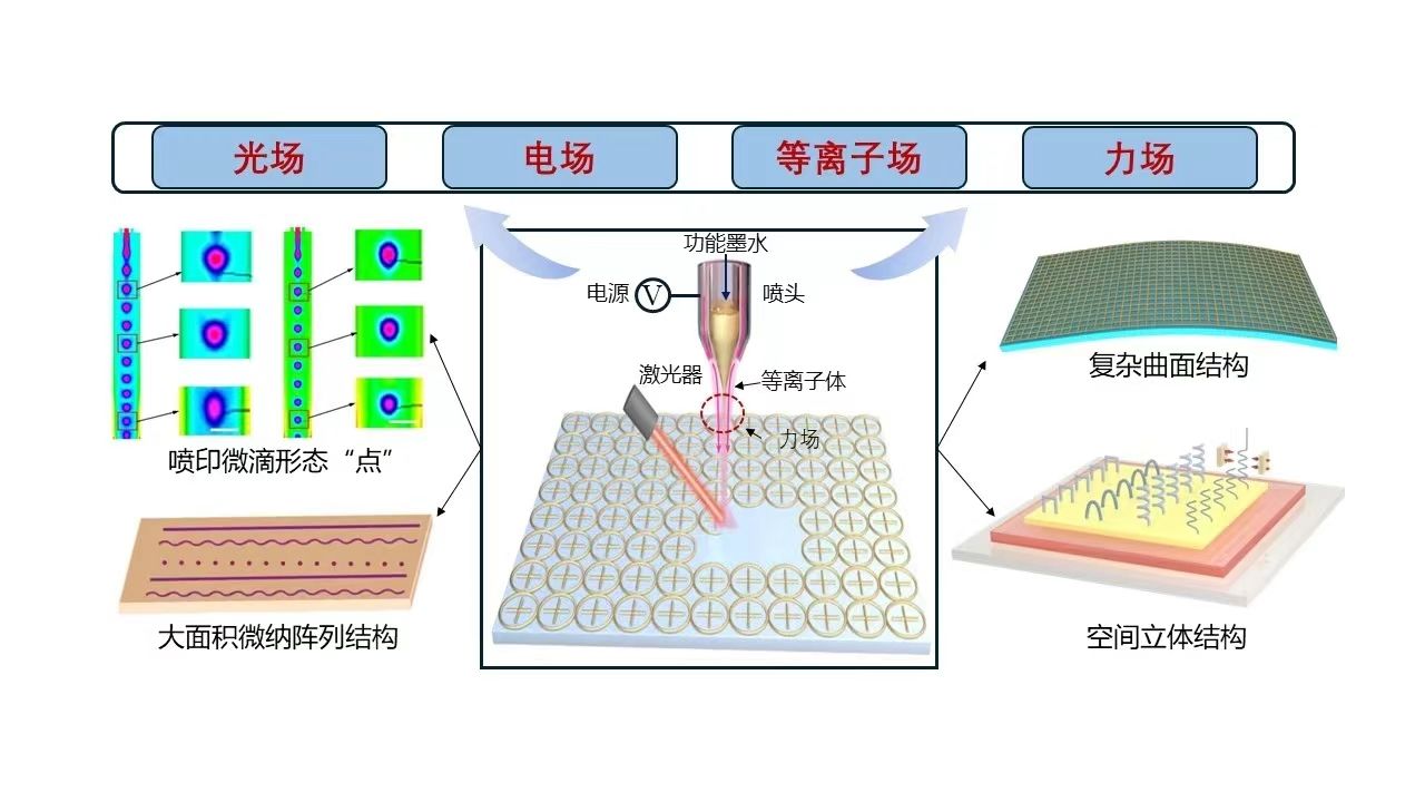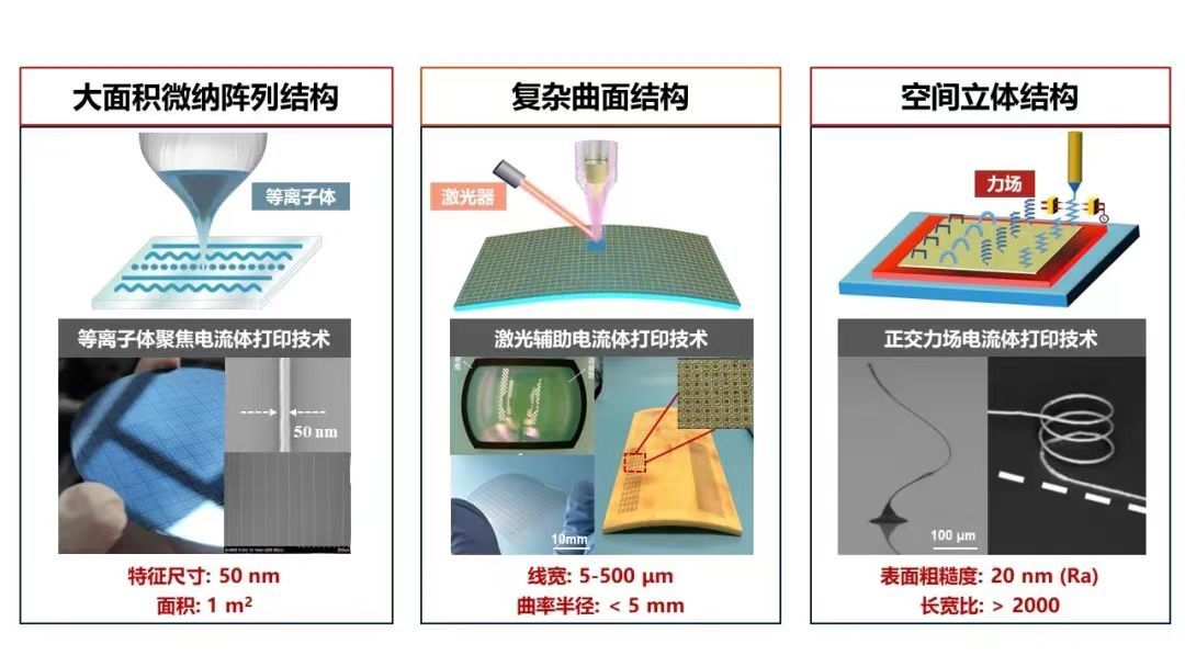 微纳打印技术具备纳米精度制造、微纳米尺度制造和跨尺度制造能力,在柔性电子、智能蒙皮、极端探测等领域具有广泛的应用前景。本项目发明了等离子体聚焦/激光辅助/正交力场电流体打印技术,开发出纳米尺度/曲面共形/空间立体系列打印装备,突破大面积微纳阵列结构、曲面共形微纳结构、跨空间纳米结构制造瓶颈,实现了微纳电子器件制造从“长流程”到“短流程”的技术变革。