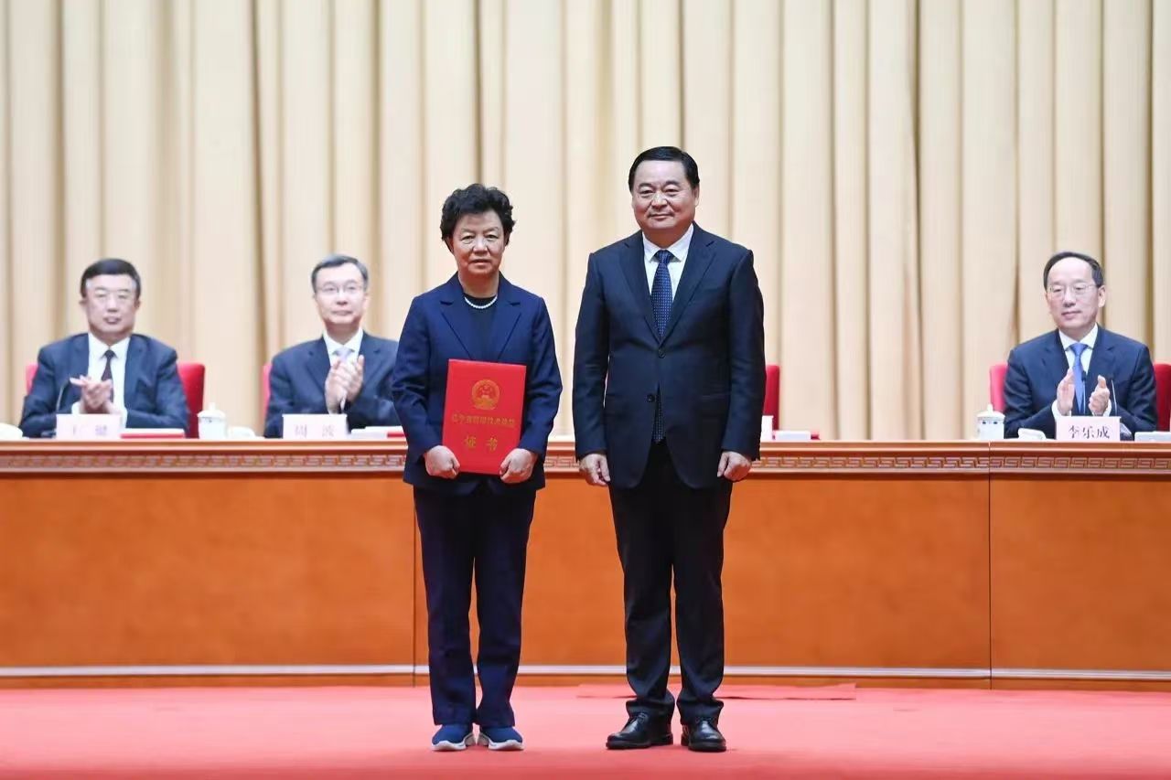 ▲省委书记、省人大常委会主任郝鹏为省科学技术奖最高奖获得者大连工业大学朱蓓薇院士颁奖。